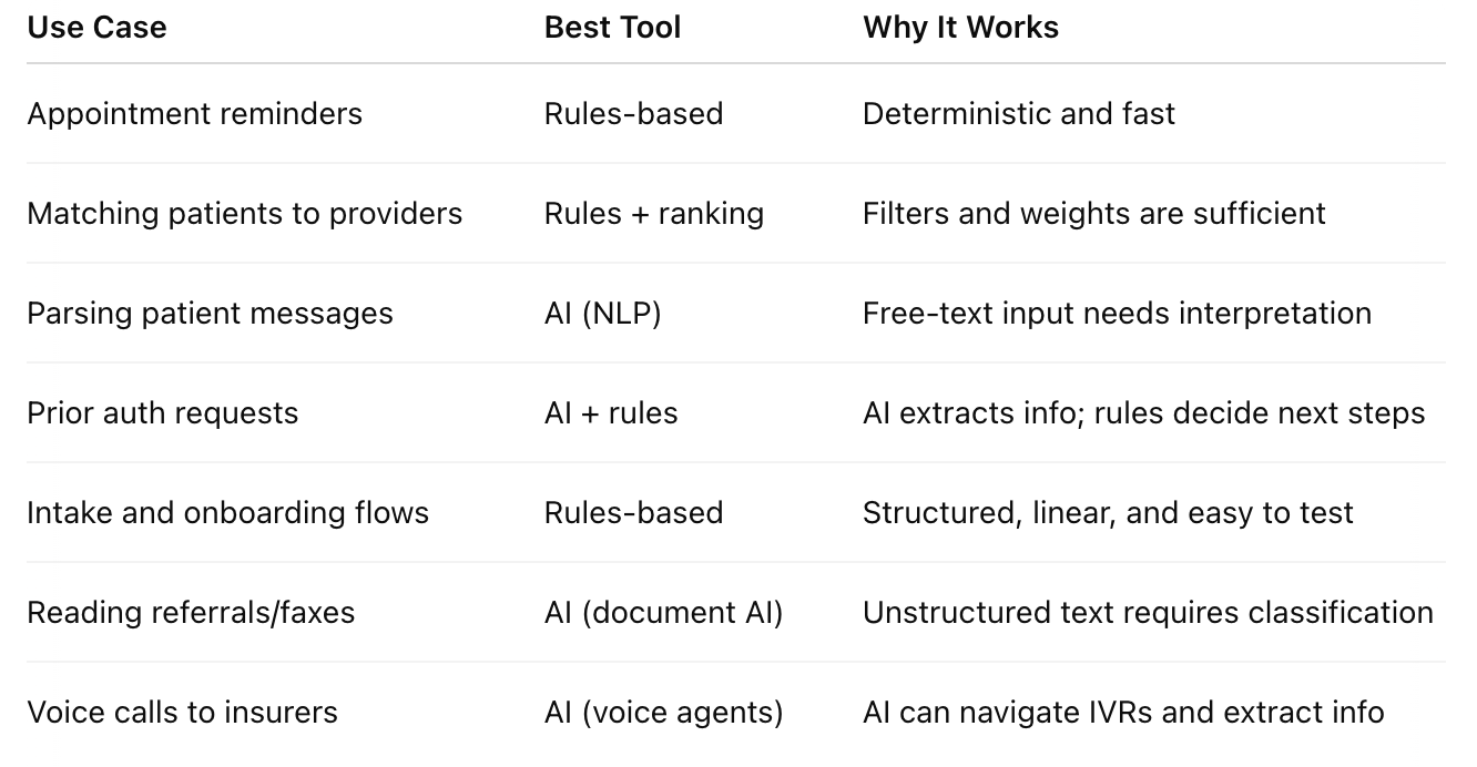 Bonus: Rules-based automation is transparent. It's easier to audit, troubleshoot, and explain — which matters in clinical and regulated settings.