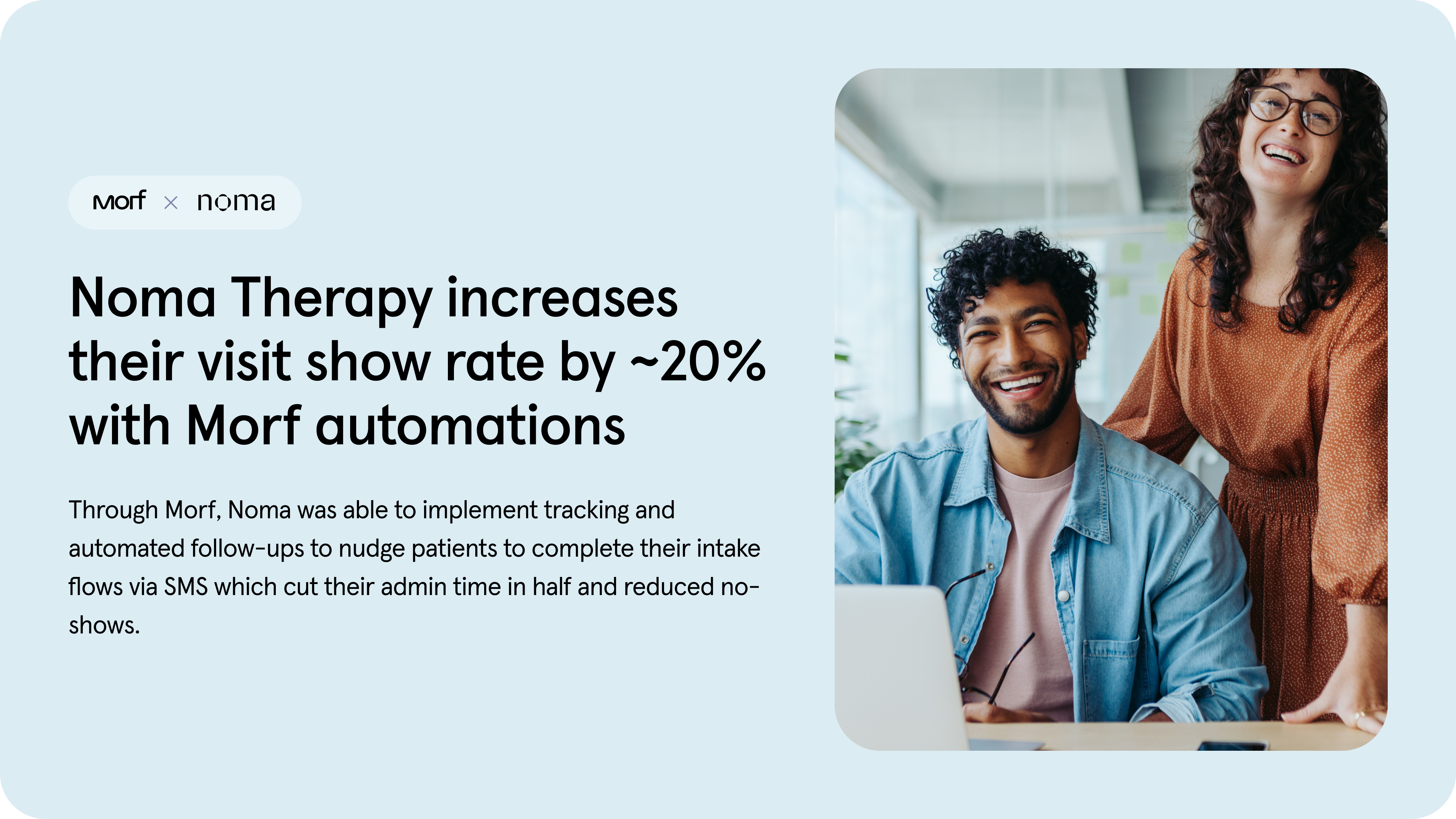 Following the implementation of Morf workflows, Noma saw outreach-focused admin hours cut in half and a ~20% increase in appointment show rates.