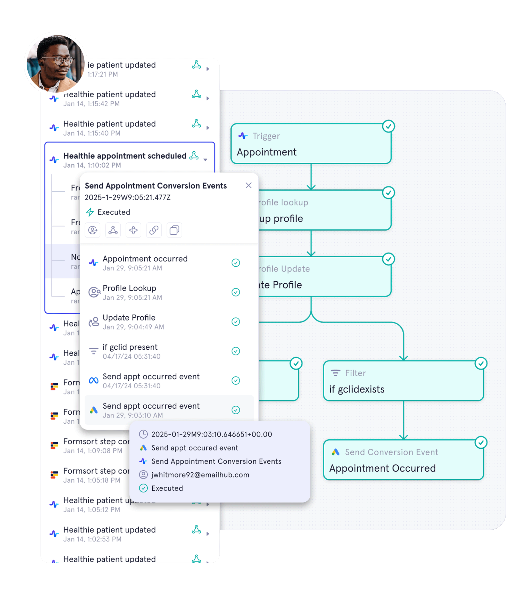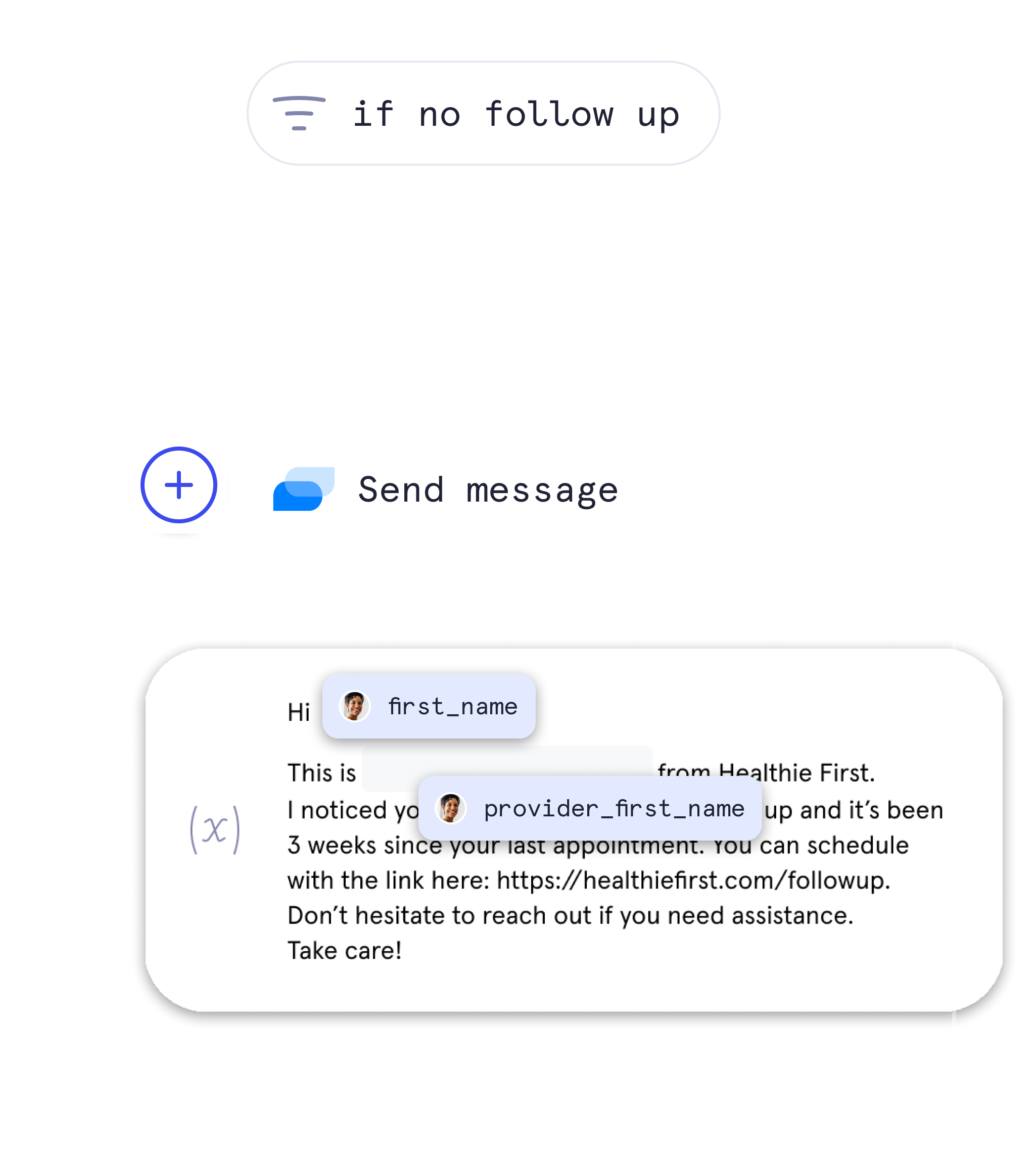 Tailor messages using data from any of your integrated tools for a personalized patient experience. For example, compose messages using a patient name and their provider from your EHR. Trigger it to send after they submit a form, and automatically route the form results into your analytics tool.
